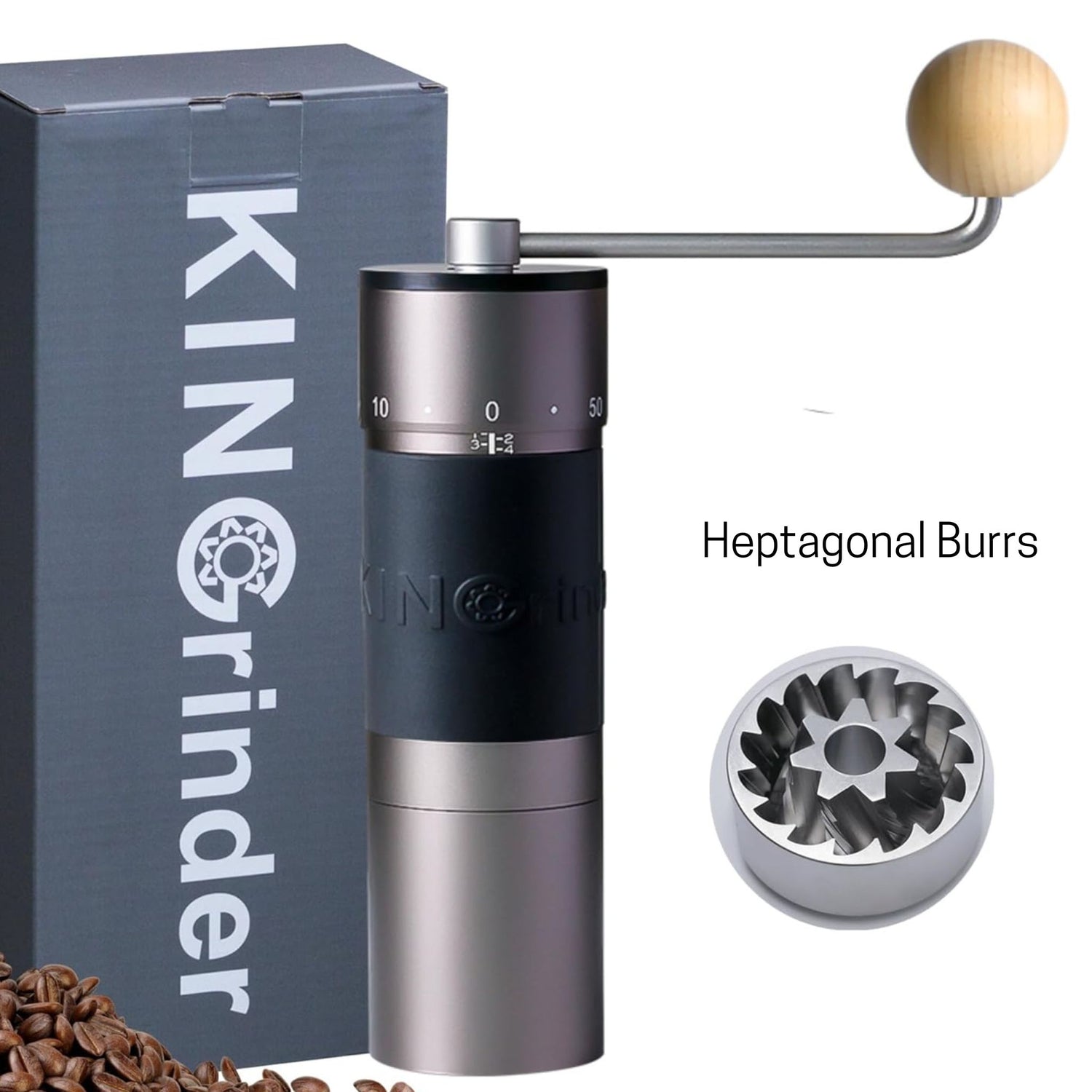 The heptagonal (seven side) burr shape provides more uniform particle size, improving extraction and flavor.